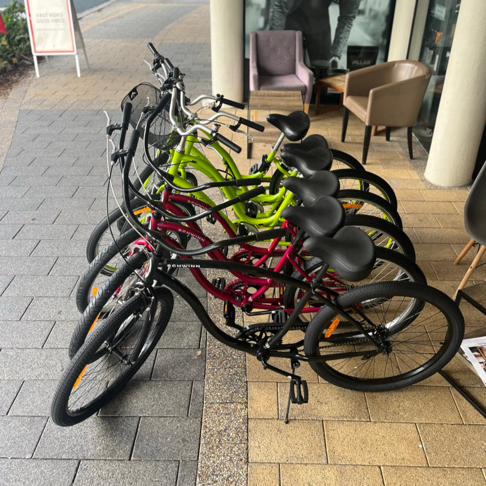 - Road bikes, e-bikes, beach cruisers, and commuters available